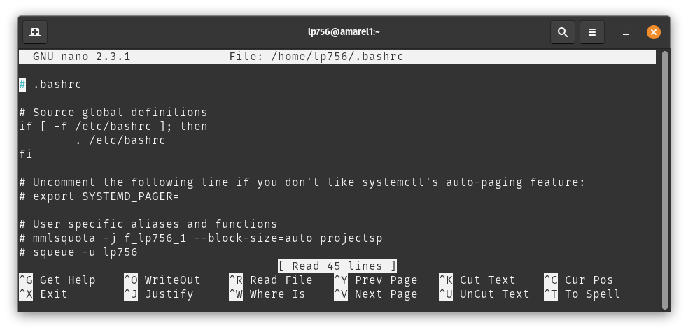 Once you’ve edited your .bashrc, press CTRL-X, and then the Y key, and then Return (one at a time, not all together). This will save and close the file. Now, the next time you open a terminal on Amarel, the new lines of code will run automatically in the background, enabling new functionality.